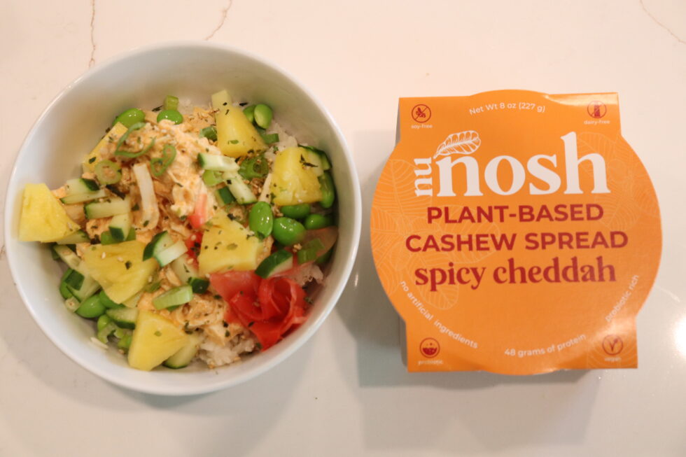 I arrived home to this incredible treat one evening, and Julia (my wife and one of the partners at Nosh) was gitty with excitement about her creation and for good reason. Poke bowls are a delicious healthy treat on their own, but remove the spicy mayo, insert spicy cheddah NuNosh, swap the crab for hearts of palm (if you are fully vegan/plant-based) and an even healthier equally delicious poke bowl is born!Â