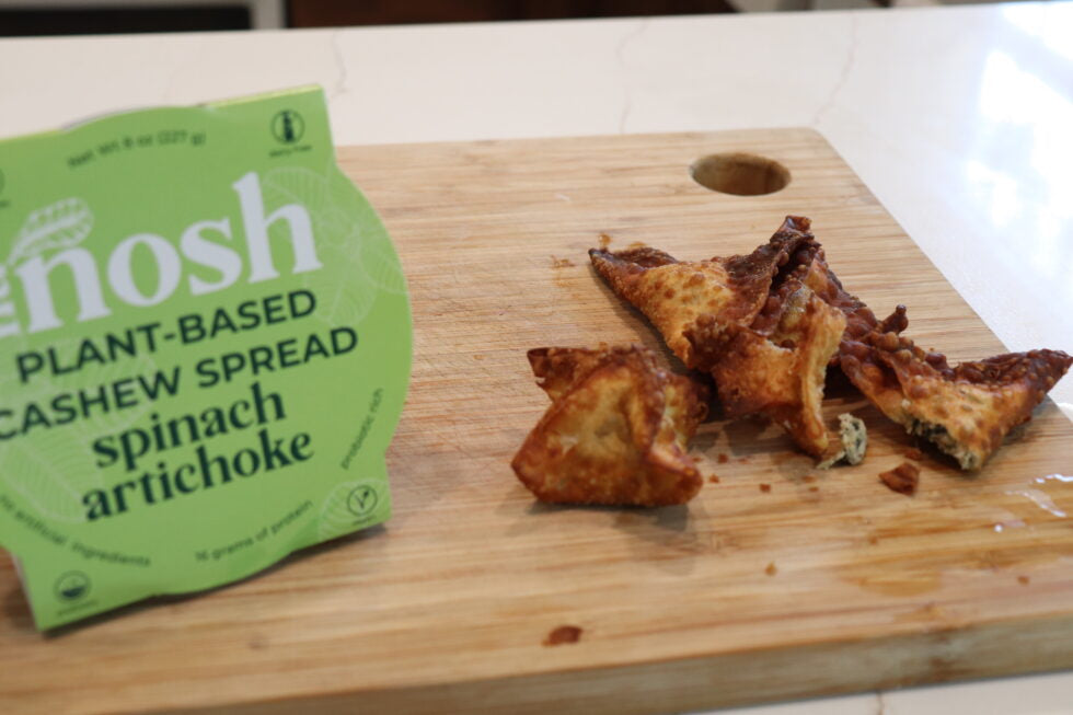 Heat canola oil over medium hight heat for 4-5 minutes. While the oil is heating, lay out wontons and wet the edges with a little water to help them seal when folding. Add 1 small dollop of NuNosh spinach and artichoke to the center of each wonton and fold. Once the oil is ready fry on each side for about 1 minute until golden brown…boooooom appetizer done!